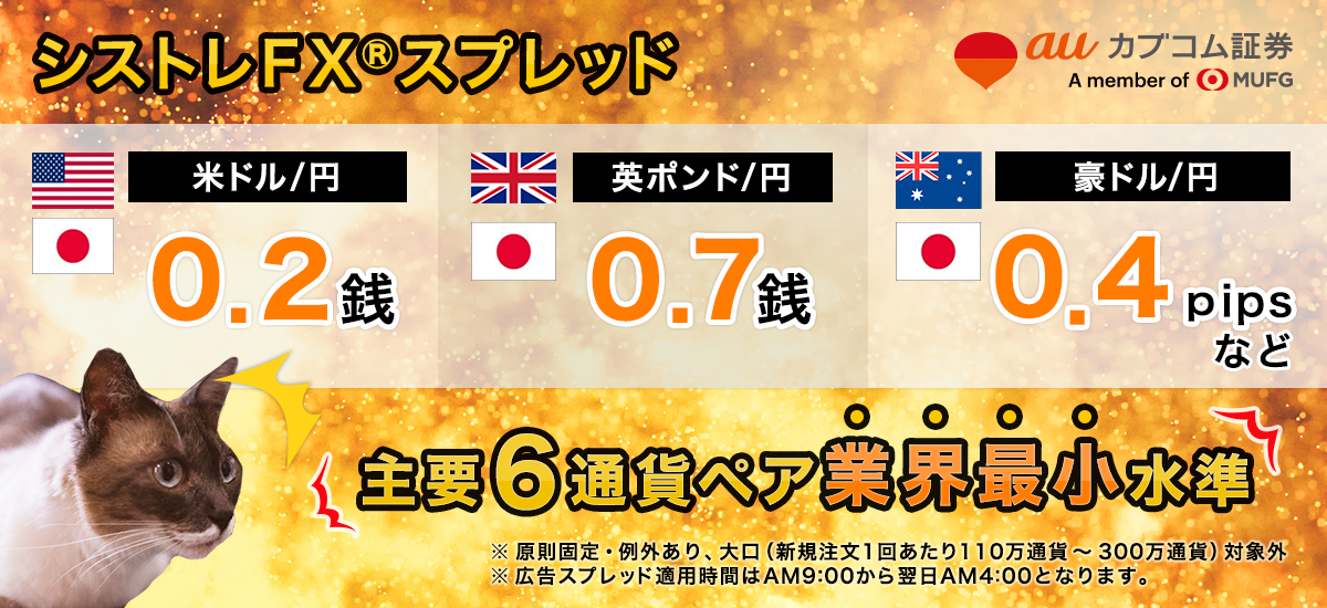 • ※シストレFX®のスプレッド適用時間はAM9:00から翌日AM4:00となります。AM4:00からAM9:00は表示スプレッドの適用外となり、スプレッドが拡大する可能性があります。